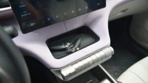 Trung tâm bảng taplo nổi bật với màn hình cảm ứng giải trí kích thước lớn 12,8 inch. Màn hình này hỗ trợ Apple CarPlay qua kết nối dây và điều khiển bằng giọng nói, đồng thời có khả năng điều chỉnh ngang hoặc dọc tùy theo nhu cầu sử dụng. Ngay phía dưới màn hình là bảng điều khiển thiết kế giống bàn phím piano với các nút bấm xếp gọn gàng. Bệ trung tâm được trang bị núm xoay chuyển số hiện đại, tạo nên sự khác biệt vượt trội.